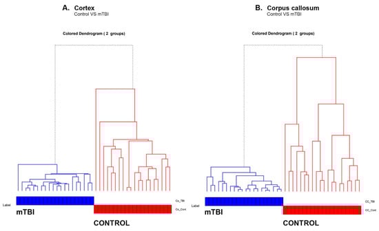 Hierarchy cluster analysis (HCA) showing the heterogeneity of the spectra belonging to the control and mTBI groups due to the bimolecular changes in (A) Co and (B) CC regions.