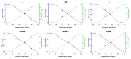 Plot of generalized estimating equation QICu fit indices below (dashed lines) and above (solid lines) the threshold for each metric against gestational age in weeks. Intersecting lines represent the estimated optimal GA binary stratification point.
