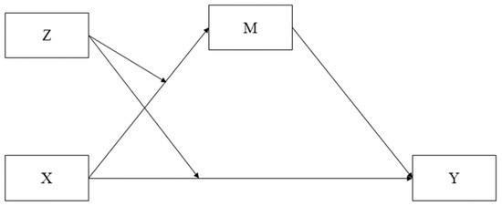 Conceptual model of conditional indirect effects. Model representing X as a predictor, Z as a moderator, M as a mediator, and Y as a dependent variable.