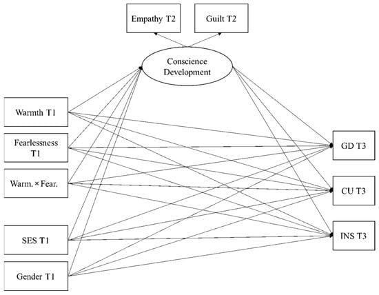 Structural equation model computed to test conditional indirect effects in the current study. The model considers parental warmth as the predictor, fearlessness as the moderator, conscience development as the mediator; Grandiose–Deceitful (GD), Callous–Unemotional (CU), Impulsive–Need of Stimulation (INS) traits as the dependent variables; and socioeconomic status (SES) and gender as the control variables.