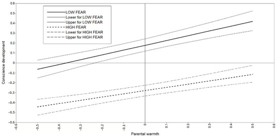 The standardized results regarding the direct relationships modeled in Figure 2 are shown in Table 2. Control variables (SES and gender) significantly predicted CD, with higher levels of SES and being female predicting higher levels of CD in children. Parental warmth significantly and positively predicted CD; i.e., higher levels of warmth predicted higher levels of CD in children. Children’s fearlessness significantly predicted CD negatively, and GD and INS traits positively; that is, higher levels of fearlessness predicted lower levels of CD and higher levels of interpersonal and behavioral traits in children. For its part, CD significantly and negatively predicted all three psychopathy dimensions in children. Finally, a negative interaction between parental warmth and fearlessness significantly predicted CD. The interaction term reflects that the positive relationship of warmth with CD tends to be stronger when children show low levels of fearlessness (see Figure 3). However, the very low magnitude of the interaction prevents us from clearly visualizing the differential tendency on the slopes.