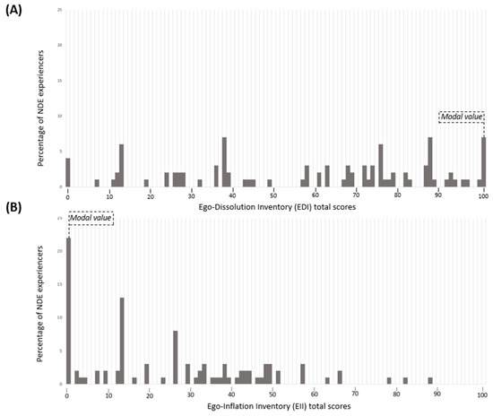 (A) The chart above refers to the frequency distribution of the experience of ego dissolution (EDI total scores) in all experiencers. Note that the only modal value is 100, even if the grouping of the different total scores in one single histogram bar visually pretends there are other modal values (same histogram bar heights for the bars at 38% and 88%). (B) The chart below refers to the experience of ego inflation (EII total scores) in all experiencers.