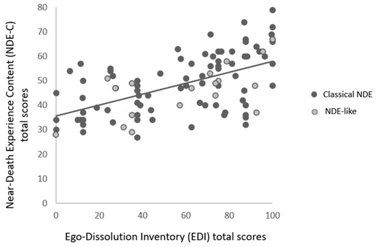 Fisher’s r-to-z transformations were calculated to test any significant difference between the correlation coefficients between the NDE-C and the EDI total scores in the two groups of experiencers (i.e., classical NDE vs. NDE-like groups).