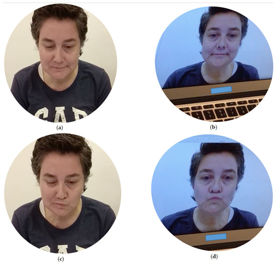 Representation of (a) real smile gesture; (b) simulated smile gesture by Specular Face at real time; (c) real kiss gesture and (d) simulated kiss gesture by Specular Face at real time.