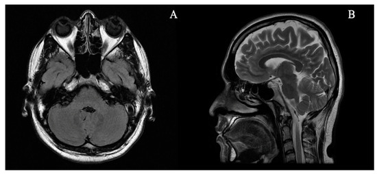 Magnetic Resonance Imaging of the brain showing no significant abnormalities and no cerebellar atrophy. (A) Axial Flair weighted image. (B) Sagittal T2 weighted image.