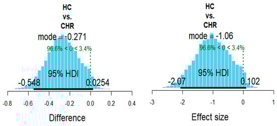 After accounting for the SOFAS scores, the metabolite level in the HC group was smaller than in the CHR group (mode difference = −0.27, PP = 0.97; effect size −1.06, PP = 0.97). Summary statistics of the posterior distributions of the model’s parameter estimates are reported in Table 2. Figure 2 shows the posterior distributions of the estimated between-groups difference in GSH.