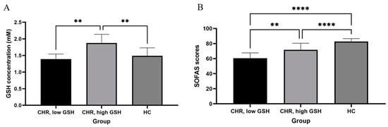 Median split analysis of glutathione (GSH) on the SOFAS. (A) Mean (± SD) glutathione concentrations (mM) of the low-GSH (< 1.60 mM; N = 7) and high-GSH (> 1.60 mM; N = 6) subgroups of clinical high-risk (CHR) cohorts as well as of the healthy controls (HC; N = 30). (B) Mean (± SD) SOFAS scores of the same three groups. Asterisks denote significant differences between the groups based on one-way ANOVA with the Tukey’s multiple comparison test, with ** denoting p < 0.05 and **** denoting p < 0.001.