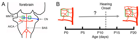 - Brandebura, A.N.; Morehead, M.; Heller, D.T.; Holcomb, P.; Kolson, D.R.; Jones, G.; Mathers, P.H.; Spirou, G.A. Glial cell expansion coincides with neural circuit formation in the developing auditory brainstem. Dev. Neurobiol. 2018, 78, 1097–1116. [Google Scholar] [CrossRef]
