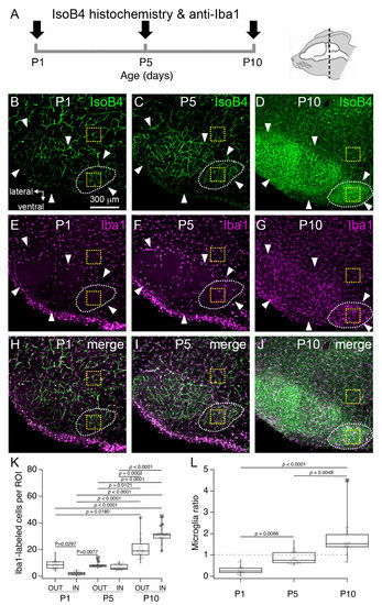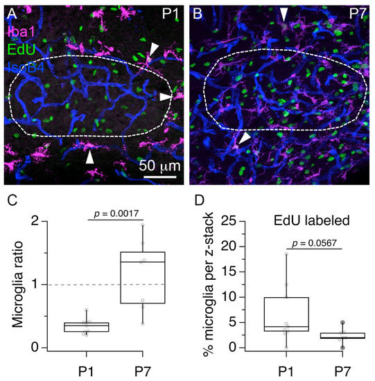 - Arnoux, I.; Hoshiko, M.; Mandavy, L.; Avignone, E.; Yamamoto, N.; Audinat, E. Adaptive phenotype of microglial cells during the normal postnatal development of the somatosensory “Barrel” cortex. Glia 2013, 61, 1582–1594. [Google Scholar] [CrossRef] [PubMed]