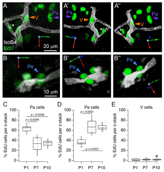 3.4. Microglia Are Perivascular Cells with Proliferative Activity