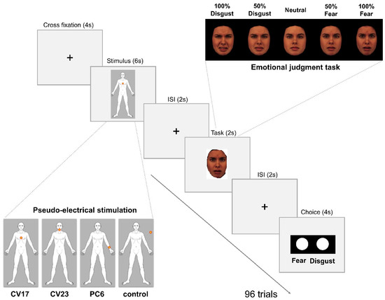 After pseudo-electrical acupuncture stimulation, the participants conducted an emotion judgment task while still inside the fMRI scanner. There were eight blocks with twelve trials each, comprising two blocks for each condition (stimulation on CV17, CV23, PC6, and the control site). Brain scanning took place after the participants had completed the first four blocks. In a two-alternative forced-choice task, the participants were instructed to classify emotional faces as either fearful or disgusted. The methods were described in part in our previous study [25]. The pseudo-electrical acupuncture stimulation was presented for six seconds after visual fixation on a cross on the center of the screen. After pseudo-electrical acupuncture stimulation, a fixation cross was displayed during an inter-stimulus interval ranging from 800 to 3200 ms (average 2000 ms). This was followed by a 2 s presentation of a face image, which was pseudo-randomly selected from five emotional facial expression stimuli (100% fear, 50% fear, neutral, 50% disgust, and 100% disgust). The images of emotional facial expressions were made from 24 pictures of eight individuals: four each of men with fearful, neutral, and disgusted faces and four each of women with fearful, neutral, and disgusted faces from the Karolinska Directed Emotional Faces database (http://www.emotionlab.se/resources/kdef (accessed on 3 June 2015)). Following a second inter-stimulus interval showing the fixation cross, participants were asked to classify the presented face as fearful or disgusted within 4 s (Figure 1).