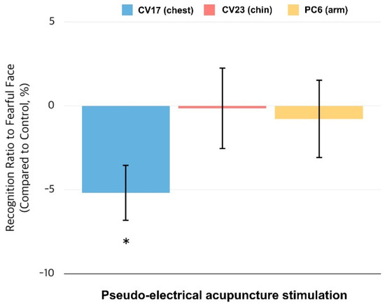 We used acupoints on three different body parts, CV17 (chest), CV23 (chin), and the left PC6 (forearm), for pseudo-electrical acupuncture stimulation. According to the bodily sensation map, CV17 is located in the body region that is most strongly related to fear, while CV23 is located in the body region that is most strongly related to disgust [23]. CV17 acupoint, located at the middle of the chest, has been well-known to relieve psychological problems and autonomic dysfunctions [36,37]. Although stimulation at the other acupoint, PC6, is prescribed for relief of emotional stress [38,39,40], this site is not located on the emotion-specific bodily sensation map [23]. The study was conducted during fMRI. Before they entered the fMRI scanner, we attached sticker-type electrodes designed with a carbon-filled plastic snap (ClearScan; Vermed, Inc., Rockingham, VT, USA) to three different acupoints on the participants, CV17, CV23, and the left PC6, without any invasive processes. The order of stimulations was counterbalanced.