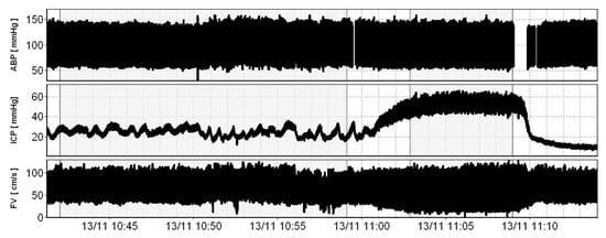 Retrospective analysis of previously published data was performed [,,,,,]. From among 160 head-injured patients treated in the Neurocritical Care Unit, Addenbrooke’s Hospital in the years 1992–1995, 31 presented ICP plateau waves, defined as a sudden rise in ICP above the value of 40 mmHg that lasted at least 5 min. All of the patients were analgosedated, intubated and mechanically ventilated to achieve mild hypocapnia (end-tidal pCO2 3.5–4 kPa); further details on patients’ clinical data, treatment protocol and data acquisition methodology were thoroughly described elsewhere []. In 96 patients, intermittent recording of ICP, ABP and TCD was performed on a daily basis, for periods ranging from 20 min to 4 h. A total of 18 recordings captured in 8 patients (2 women, 6 men; age 19–36 years) covered the entire course of plateau ICP wave and, therefore, were available for analysis. Artefacts resulting from nursing interventions were removed manually.