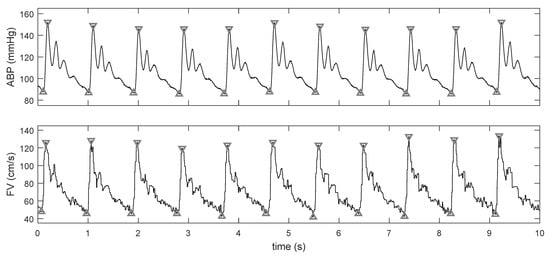 Recordings were manually divided into periods of baseline ICP (normal or elevated) and stable phases of plateau (Figure 1). An automatic detection of points characteristic to each cardiac cycle, that is maximal (peak of systole) and minimal (end-diastolic) values [], was performed on courses of raw ABP and FV signals (Figure 2). Subsequently, signals were sliced into single cardiac cycles, and then, the representative cycle of ABP as well as that of FV were derived by a process of aligning all individual cycles and averaging them, which reduced the noise. This technique also allowed us to reduce time delay between ABP and FV signals.