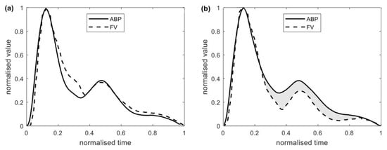 Representative cycles of ABP and FV waves at baseline (a) and during a plateau wave (b), obtained after the procedure of time alignment and normalisation described in the Materials and Methods section. The area where the normalised value of FV is lower than the one of ABP is shaded.