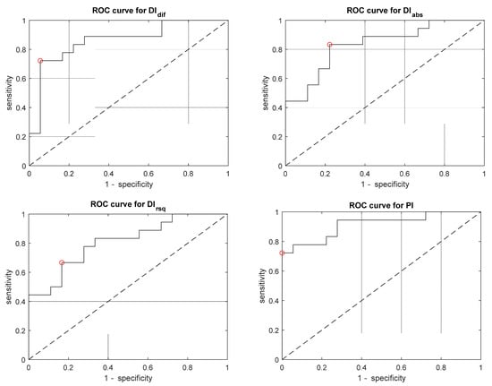 Receiver operating characteristic (ROC) curves showing the performance of given indices to discriminate between baseline ICP vs. plateau wave. The circle denotes the optimal operating point.