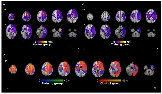 Lesion coverage proportion maps of training and control groups. Lesions were manually segmented and overlaid onto the reference standard brain template by means of the clinical toolbox [27,28]. The percentage values represent the lesion overlap within (A,B) and between (C) groups.