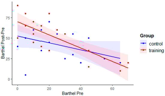 The ANCOVA model revealed that, when controlling for T0 scores, a significant Group effect emerged on the post-rehabilitation scores on the Barthel scale (F(1,33) = 4.2, p = 0.049, and partial η2 = 0.113). Namely, participants of the training group obtained higher scores at T1 compared to the control group. In order to explore the association between pre-rehabilitation Barthel scores and post–pre difference (gain) in Barthel scores, an ANCOVA with gain as dependent variable, pre-rehabilitation Barthel score as covariate, and Group as independent variable was performed. The results (see Figure 2) revealed a negative correlation between gain and pre-rehabilitation Barthel score (main effect of pre-rehabilitation Barthel score: F(1,33) = 21.32, p < 0.001, and partial η2 = 0.392), and confirmed an overall higher difference in the training group (F(1,33) = 4.2, p = 0.049, and partial η2 = 0.113). The interaction was not significant (F(1,33) = 2.12, p = 0.15), meaning that in both group pre-rehabilitation Barthel score and gain were correlated. As evident in Figure 2, patients with lower Barthel scores at T0 gained larger benefits than patients with higher Barthel scores at T0.