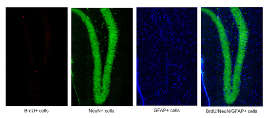 In order to evaluate possible changes in proliferation, migration, and differentiation of newly formed cells labeled with BrdU marker into NeuN and GFAP, immunohistochemical staining of BrdU/NeuN and BrdU/GFAP positive cells was performed. Single 50 µm free-floating sections (stored at 4 °C in phosphate-buffered saline PBS with 0.1% sodium azide) were stained according to the methods described previously [31,32,33,34]. A representative image with colocalization of BrdU/NeuN/GFAP positive cells is shown in Figure 1.