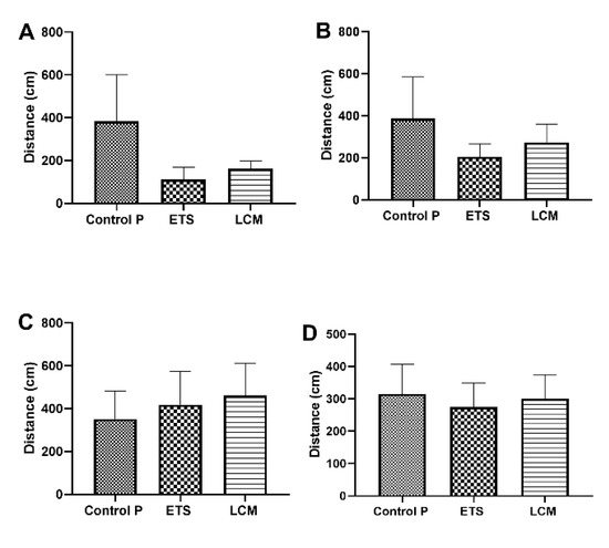 The obtained results showed that the distance for LCM and ETS-treated PILO mice, starting from the IQ, IIQ, and IVQ quadrant was much shorter than the PILO control group (Figure 4A,B,D), while the distance traveled from the IIIQ quadrant was longer compared to the PILO control mice (Figure 4C). Nevertheless, these differences were not statistically significant.
