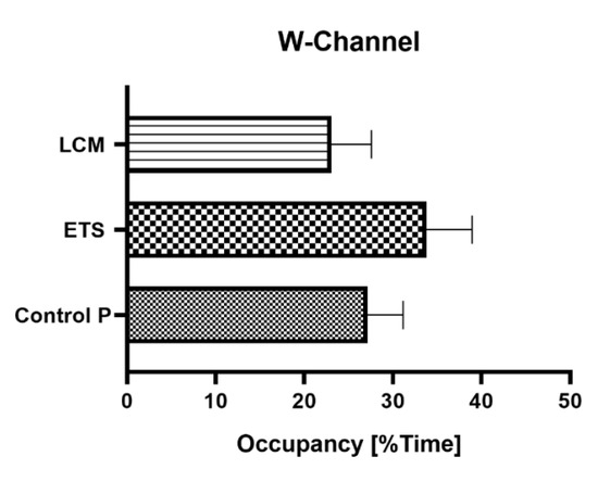 A very important parameter that enables the tracking of spatial disturbances in the tested animals is the mean percent of time spent in the W-Channel. The averaged values of all quadrants indicated that LCM PILO group spent less time in the channel in comparison to the PILO control mice, while for the ETS PILO group it was higher; however, the differences were not significant (Figure 5).