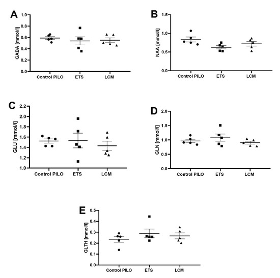 The presented studies assessed the effect of long-term administration of ETS and LCM on the level of selected neurometabolites, showing no changes in the level of tested metabolites in both groups compared to the PILO control group. MRS spectroscopic examination enables the identification and measuring of the levels of neurometabolites and neurotransmitters, which may play an important role in the proper neurogenesis process, such as NAA and Glth, Glu, Gln, and GABA [41]. This method is also gaining popularity in studies evaluating the mechanisms of drug-induced neuronal damage as well as further behavioral and cognitive changes. Moreover, apart from simply identifying brain changes resulting from drug use, MRS has the potential to track disease progression and/or treatment [42]. Currently, it is known that drugs whose mechanism of action is based on the intensification of GABAergic neurotransmission, such as vigabatrin [43], topiramate [44], and gabapentin [44,45], increase the concentration of GABA in the brain. Indirectly, ASM may also affect the concentrations of other metabolites. There is a lot of scientific data from animal models of epilepsy (especially after SE induction) demonstrating a significant decrease in NAA levels [41,46,47]. The NAA level reflects the quantity and functional metabolic state of neurons, and its concentration decreases with neuronal damage and/or dysfunction [48,49]. Moreover, Campos et al. [50] studying TLE patients showed decreased NAA concentrations. On the other hand, a reduced concentration of myo-inositol (Ins) after VPA treatment in patients with epilepsy was observed, while NAA and creatine levels did not change. However, the lower level of Ins was probably not linked with the anti-seizures properties of VPA [51].