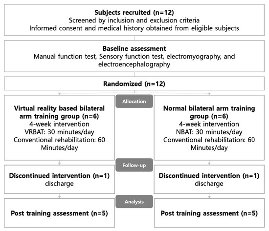 Diagram showing the flow of the study. VRBAT, virtual reality-based bilateral arm training; NBAT, normal bilateral arm training.