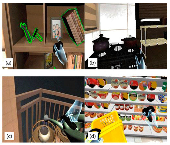 The VR tasks performed included everyday activities, such as turning on lights, organizing a chest of drawers, organizing a kitchen, watering plants, and purchasing items at a convenience store. The virtual living room, kitchen, veranda, and convenience store were designed to simulate real environments.