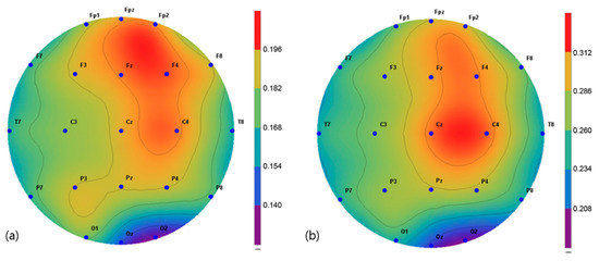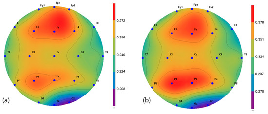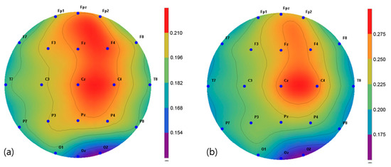Mapping of the alpha power value (a) before and (b) after training in the virtual reality-based bilateral arm training group.