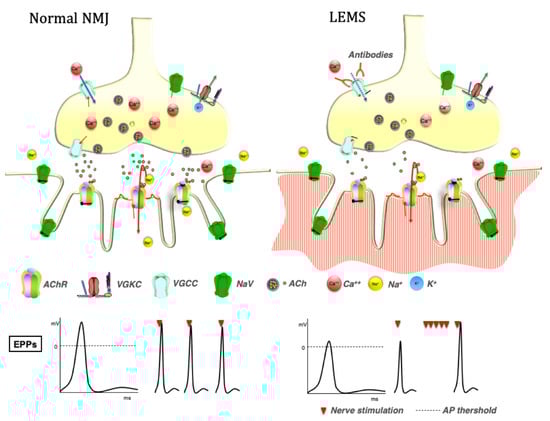 Clinically, LEMS is characterized by proximal muscle weakness, dysautonomia, and reduced or absent deep tendon reflexes, due to a reduced release of ACh from the motor nerve terminal. Characteristically, muscle strength, as well as deep tendon reflexes, can increase transiently after a forced muscle contraction, differentiating LEMS from MG. This feature, called post-exercise facilitation, can also be observed after high-frequency nerve stimulation [41]. Indeed, LEMS is characterized by reduced evoked endplate potential amplitude with normal miniature endplate potential amplitude, in accordance with a significant reduction in ACh release and normal postsynaptic sensitivity to ACh (Figure 1). However, HFRS can overcome the calcium channel blockade [41,42]. This effect is believed to be caused by calcium accumulation at the presynaptic terminals, leading to an increased probability of ACh release (Figure 1).