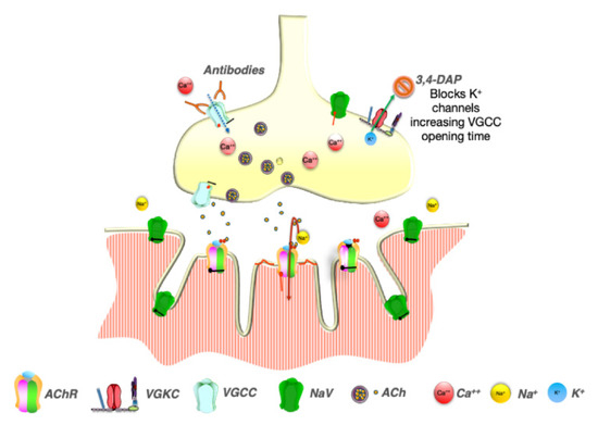 In health, the EPP is usually sufficient to reach the threshold for opening voltage-gated sodium channels generating an action potential that propagates along the muscle fiber leading to contraction (Figure 1). The extent to which the EPP exceeds the threshold for the generation of an action potential is called the “safety factor” of neuromuscular transmission, and it allows the NMJ to continue functioning under different conditions. The EPP is short-lived since both AChRs and VGCCs close spontaneously while ACh disperses by diffusion or is hydrolyzed by the AChE. The opening of VGKCs at the presynaptic membrane restores the membrane potential and limits the opening of VGCCs [3].