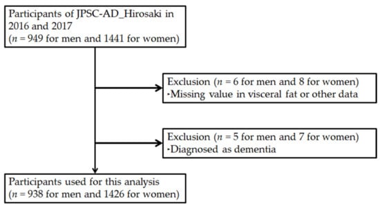 The Japan Prospective Studies Collaboration for Aging and Dementia’s (JPSC-AD) Hirosaki study, one study field of the JPSC-AD [], was launched in 2016 as a 12-year prospective cohort study, aiming to elucidate the causative factors of dementia and to develop preventative methods. Visceral fat was measured as a unique item of the JPSC-AD Hirosaki study. Therefore, one of the aims of this study was to evaluate the effect of VFA on dementia.