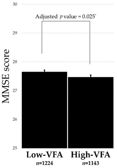 VFA was negatively and significantly associated with an MMSE score (r = −0.401 and p value = 0.0499; Spearman). The association between each VFA group and MMSE score is shown in Figure 2. Therefore, the p value was calculated by analysis of variance for a linear regression model with an MMSE score as an objective variable, and VFA status and covariates such as age, sex, muscle mass, education, smoking, BMI, exercise habits, alcohol consumption, and prevalent confounding disease (depression, hypertension, hyperlipidemia, and diabetes). After adjusting for related factors, the high-VFA group had significantly lower cognitive function than the low-VFA group (27.7 ± 0.07 for low-VFA group and 27.5 ± 0.07 for high-VFA group; adjusted p value = 0.025). Furthermore, to evaluate the association between cognitive impairment and visceral fat, the incidence of cognitive impairment according to VFA was assessed (Supplementary Table S1). The high-VFA group had a significantly higher incidence of cognitive impairment than the low-VFA group (7.3% for high-VFA group and 5.0% for low-VFA group; p value = 0.036).