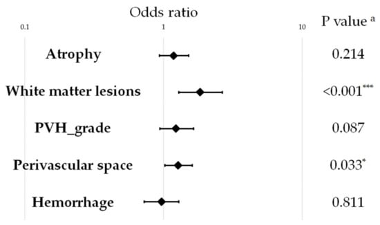 Association between brain structure and visceral fat area using magnetic resonance imaging. Data are presented as the odds ratio and 95% confidence intervals. a p value was adjusted using logistic regression, adjusting for age, sex, muscle mass, education, smoking, body mass index, exercise habits, alcohol consumption, and prevalent confounding diseases (depression, hypertension, hyperlipidemia, and diabetes). * p < 0.05; *** p < 0.001.