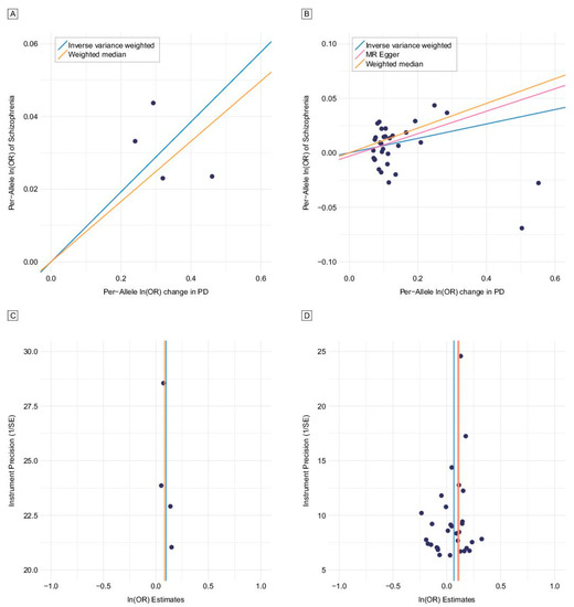 Mendelian randomization analysis for risk of Parkinson’s disease (PD) on schizophrenia using genetic instruments. (A) Schizophrenia associations (scatter plot) using four genetic instruments (PD) [24]. (B) Schizophrenia associations (scatter plot) using 32 genetic instruments (PD) [15]. (C) Precision (funnel plot) using four genetic instruments (PD) [24]. (D) Precision (funnel plot) using 32 genetic instruments (PD) [15].