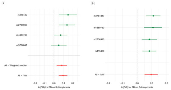 Forest and leave-one-out plots showing association with schizophrenia for each genetic instrument of Parkinson’s disease (PD). (A) Forest plot using four genetic instruments (PD) [24]. (B) Leave-one-out plot using four genetic instruments (PD) [24].