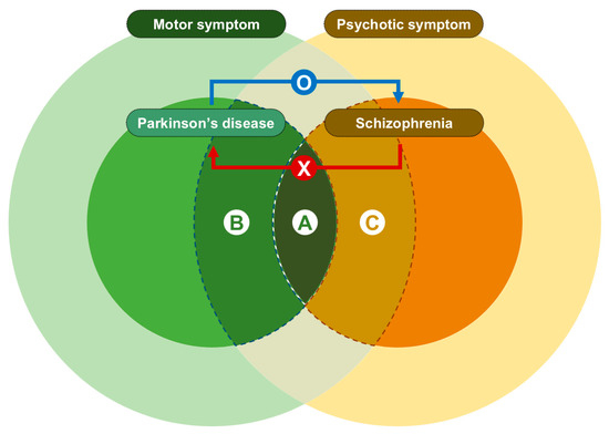 Motor symptoms in schizophrenia include extrapyramidal signs or saccadic eye movements, which are frequently observed in PD [39] (A in Figure 3) and hypokinesia, retarded catatonia, excited catatonia, echo-phenomena, or catalepsy, which are inter-related motor domains in schizophrenia [40]. Our results suggest that the motor symptom mimicking PD in schizophrenia might be related to the genetic risk of PD. Previous studies in drug-naïve schizophrenia patients with parkinsonism (A in Figure 3) have described decreased dopaminergic function in the striatum [41,42]. Considering that the main pathology of PD is dopamine depletion in the nigrostriatal pathway, these findings can be in line with our results.