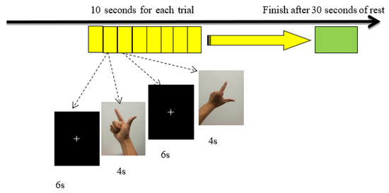 We used the E-Prime software to administer the action simulation task. The task consisted of 60 10-s trials presented on a screen in a pseudo-random order. Each trial included a fixation point (6S) and a gesture imitation task map (4S). When a new gesture imitation task appeared, the subjects were required to imitate the movement as fast as possible and to then press the ‘confirm’ key on a keyboard. After all of the 60 tasks were completed, the screen indicated that the participants could rest for 30 s, and the task ended (as shown in Figure 1). The hand gesture imitation task was divided into three experimental conditions: left hand imitation, right hand imitation, and double hand imitation. In order to facilitate the supervision of the participants, as well as the evaluation of task performance, video recording was conducted during the experiment.