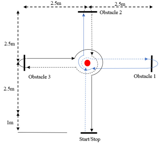 The HCT is a measure of dynamic motor coordination, coordinative ability, and cognitive capabilities, which is general and effective in measuring coordination ability. Specifically, subjects are required to move through a circuit (Figure 2) as quickly as possible. After completing a 10-min warm-up activity, the subjects were asked to start running 0.7 m from a starting point, and to move through the circuit as directed. Timing began when the participants arrived at the starting point. They were instructed to enter the circuit at the fastest speed possible, and to move through the circuit in a particular pattern to reach the end point. If the subjects made mistakes (stepping on the center point, crossing the obstacles in the wrong order, etc.) or touched any of the obstacles during the test (e.g., marker posts), they were considered to have failed the test, and were asked to repeat the test after an interval of 5 min. Two valid scores were recorded (the interval between the two tests was 5 min) for each subject, and the shortest score was selected for statistical analysis [22,23].