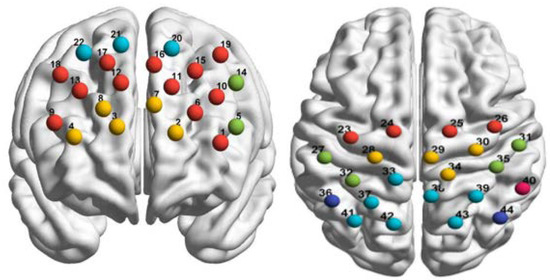 Schematic diagram of 44 channels over the frontal lobe and parietal lobe (left: frontal lobe; right: parietal lobe).