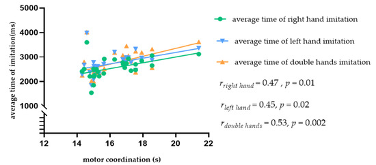 Given the significant gender differences in motor coordination, we analyzed the data from male and female participants separately. The results showed that, in female participants, there was a significantly positive correlation between motor coordination and the average time in the right hand imitation trials (rright hand = 0.47, p = 0.01), left hand imitation trials (rleft hand = 0.45, p = 0.02), and double hand imitation trials (rdouble hands = 0.53, p = 0.004). Thus, better motor coordination was linked with shorter imitation time in female students, as shown in Figure 5. Since we found no correlation between motor coordination and imitation in the male students, we did not further examine the data from this group.