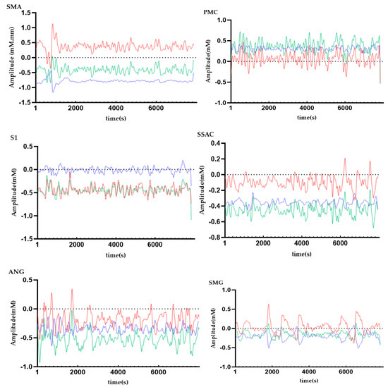 Time series of hemodynamic response for HbO (red line), HbR (blue line), and HbT (green line) across all subjects FAbbreviations: SMA = supplementary motor cortex; PMC = primary motor cortex; S1 = primary somatosensory cortex; SSAC = somatosensory association cortex; ANG = angular gyrus; SMG = supramarginal gyrus.