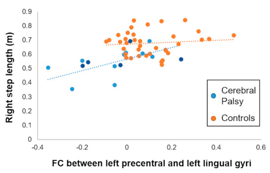 Using the regions displaying a significant reduction of FC in the youth with CP, we sought to determine whether these observed FC differences were correlated with the noted aberrant gait biomechanics. For the group with CP, higher FC between the left precentral and lingual gyri was associated a larger right step length (ρ = 0.74, pFDR = 0.04; Figure 3). This association remained significant after excluding the participants that had a hemiplegic presentation (ρ = 0.76, p = 0.01). We did not observe significant associations between the gait biomechanic variables and FC involving the other two seeds, even at an uncorrected threshold. Furthermore, none of these FCs were linked with the gait biomechanics seen in the controls (p > 0.05) or with the GMFCS level in the youth with CP (all p > 0.05).
