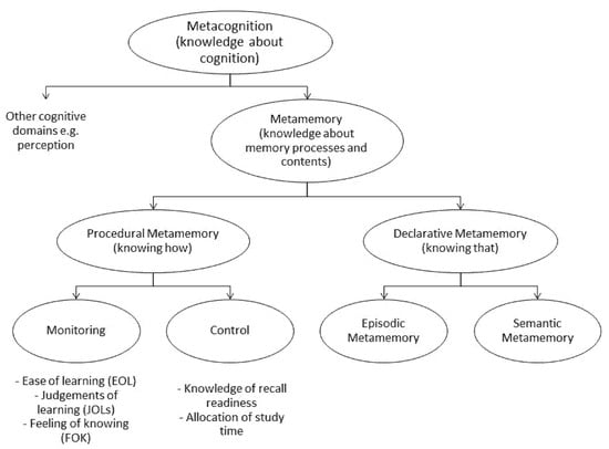 The term “metamemory” was first used by the developmental psychologist John Flavell (1971) to describe knowledge about one’s memory processes and contents []. Flavell later (1976) broadened the concept to encompass “metacognition” as referring to “one’s knowledge concerning one’s own cognitive processes and products or anything related to them” ([], p. 232). Of course, considerations of “knowing about knowing” long predate these neologisms, going back as far as classical antiquity, specifically to certain of the works of Aristotle. In the sphere of cognitive psychology, Hart (1965) developed the idea of “feeling of knowing” (FOK) [], which has been used as a method of assessing metamemory judgments for already acquired material. Judgments of learning (JOLs) form another category of postdiction used to assess (recallable) information following acquisition, whilst ease of learning (EOL) is a prediction before acquisition. These paradigms have been widely used to inform metamemory and metacognitive models in various disciplines, including not only developmental and adult psychology but also social psychology, educational psychology, in legal contexts, and neuropsychology.