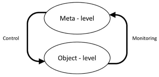 A significant theoretical development in the field of metamemory was Nelson and Narens’ (1990) distinction between monitoring and control processes []. Following the usage of David Hilbert (“metamathematics”) and of Rudolf Carnap (“metalanguage”), Nelson and Narens proposed that cognitive processes be split into two interrelated levels, the object-level and the meta-level, wherein the latter contained a “dynamic model (i.e., a mental simulation)” of the former. Flow of information between the two levels was defined by two “dominance relations”, specifically control and monitoring, whereby the meta-level monitors object-level cognitions and thus controls or modifies unstable object-level processes (Figure 2). As the two mechanisms interact at any given moment, this may be described as an online supervisory or executive system.