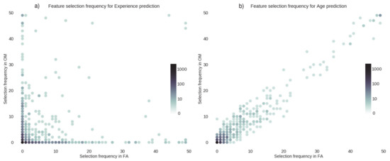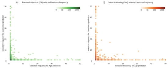 Feature selection frequency in FA and OM meditation styles. The figure shows the feature selection frequency for (a) focused attention and (b) open monitoring meditation, for age prediction (x-axis) and expertise prediction (y-axis). Each dot represents a connection (feature), and the position coordinates x and y represent the number of times this connection was selected in the regression, in all cross-validation folds. The maximum frequency value is equal to the number of cross-validation folds. The color of the dots indicates the number of features with that particular selection frequency. In these plots, dots representing features with similar frequencies in the two regression tasks lie close to the diagonal, while dots representing features with different frequencies lie far from the diagonal.
