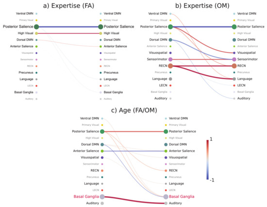We averaged and normalized the connection weights within and between networks to have an integrated view of the contributions of each large-scale network, as shown in Figure 4, for the prediction of expertise in FA (panel a) and OM (panel b) meditation and for the prediction of age (panel c).