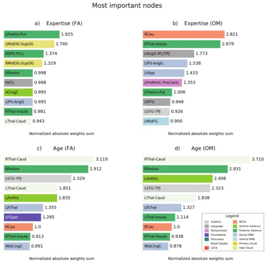 We further plotted, in Figure 5, the normalized absolute weights of the ten most important nodes for the prediction of meditation expertise (Figure 5a,b) and for the prediction of age in both meditation forms (Figure 5c,d).