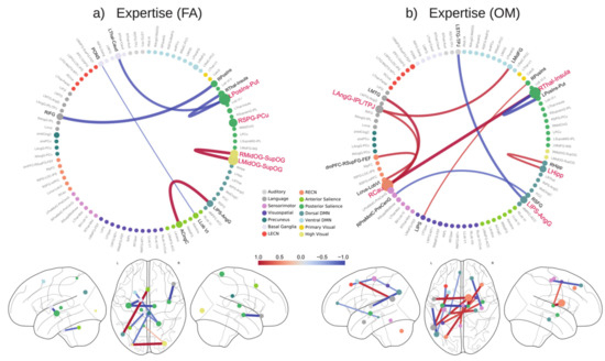 In Figure 6 we plotted the contribution of the connections in the prediction of meditation expertise in FA (panel a) and OM (panel b) meditation.