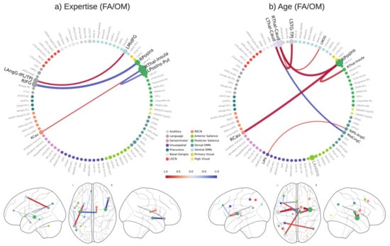 In Figure 7 we show the connections that were used to predict expertise (panel a) and age (panel b) and those shared in both meditation styles; we chose those that were selected 95% of the time in the regression models.
